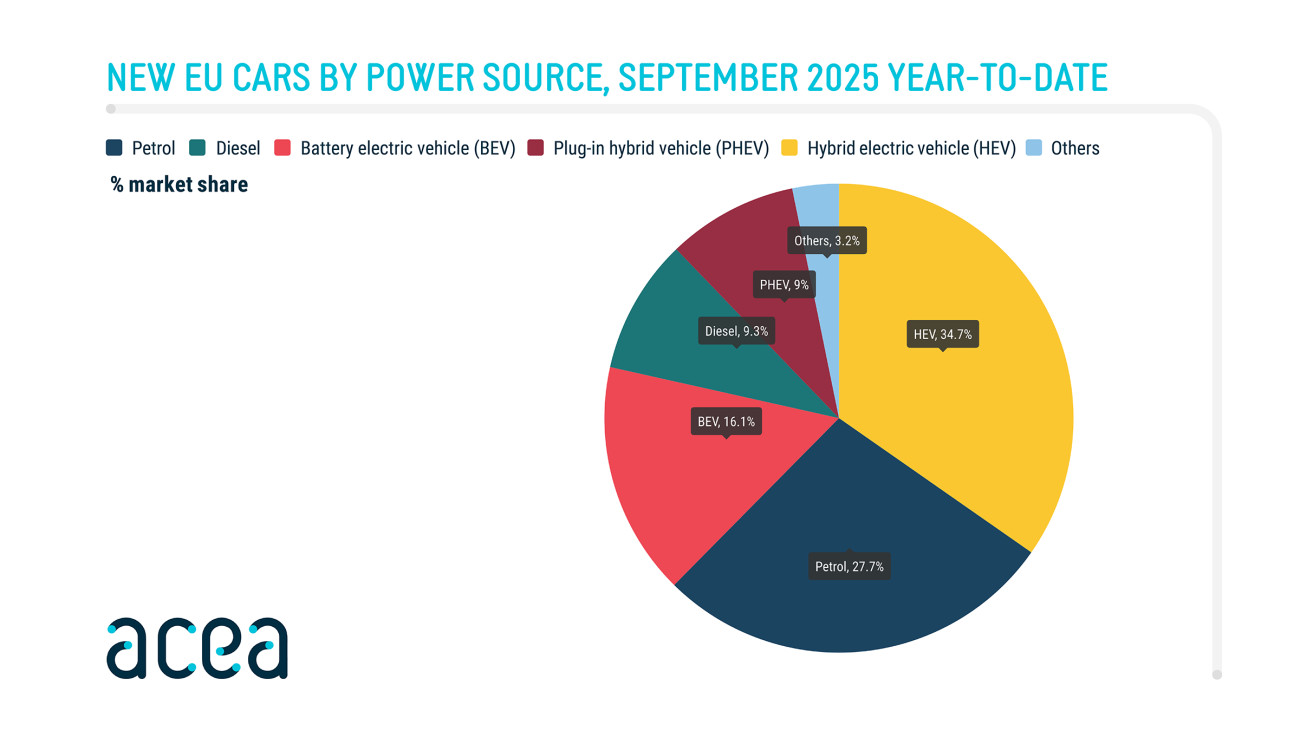 Az idei első három negyedévben az EU-ban az autóeladások 0,9 százalékkal, 8 millió 57 ezerre nőttek. A szeptember végéig 1 millió 300 ezer 188 új akkumulátoros elektromos autót (BEV) regisztráltak, ami az uniós piaci részesedés 16,1 százalékát tette ki, a részesedés nagyobb az egy évvel korábbi 13,1 százaléknál. A benzinüzemű autók részesedése 27,7 százalékra zsugorodott az egy évvel korábbi 34,4 százalékról a dízelüzeműeké pedig 12,4 százalékról, 9,3 százalékra csökkent.