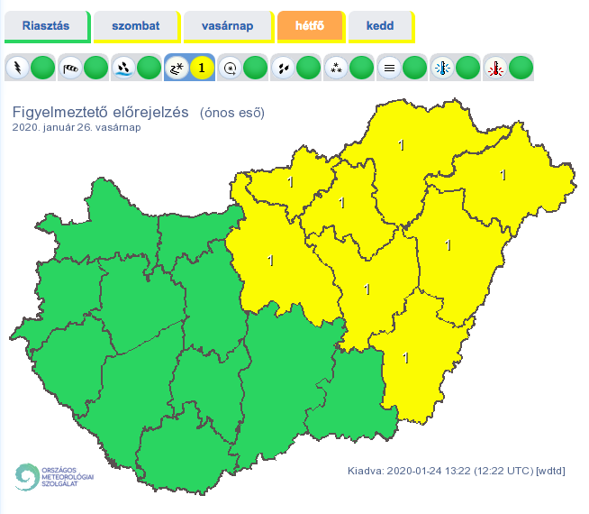 Hétfőn túlnyomóan borult lesz az ég, párás, helyenként ködös marad a levegő. Legnagyobb eséllyel keleten eshet az eső, ónos eső is hullhat. A nyugatias szél mérsékelt marad. A legalacsonyabb éjszakai hőmérséklet +2 és -3, a legmagasabb nappali hőmérséklet 0 és +5 fok között alakul.