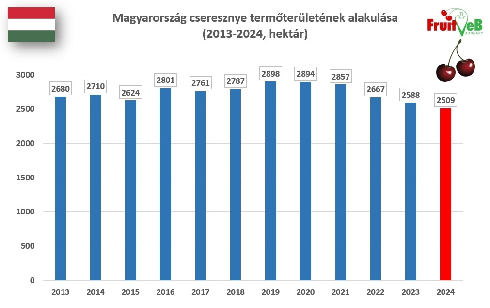 Hazánkban is megjelentek már a nagyobb termésbiztonságú – öntözött, fagyvédett, jéghálós és adott esetben esővédő fóliával takart – szuperintenzív ültetvények, de 80-90 százalékban félintenzív művelési rendszerben zajlik a termelés – írta még a portál. A cseresznye termőterülete a 2020-ig tartó enyhe növekedés után az utóbbi években csökkenő tendenciát mutat, mára 2500 hektárnyi termőfelületről beszélhetünk.