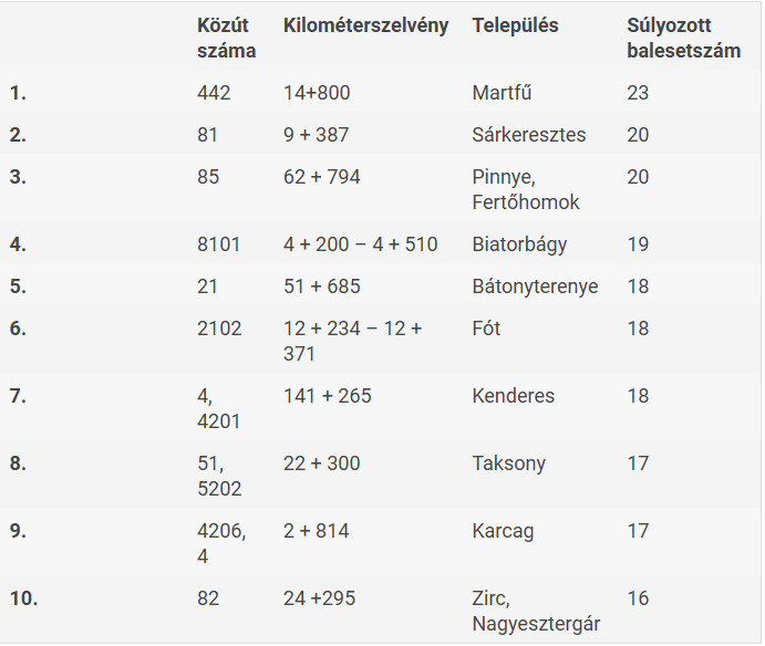 Idén is elkészült az elmúlt három esztendő (2022, 2023, 2024) alapján a „baleset-sűrűsödési helyek” listája, amely 101 közlekedési pontot tartalmaz, benne nemcsak az országos közúti, hanem az önkormányzati és egyéb kezelésű utakat is, vagyis ez ma a legrészletesebb ilyen lista.