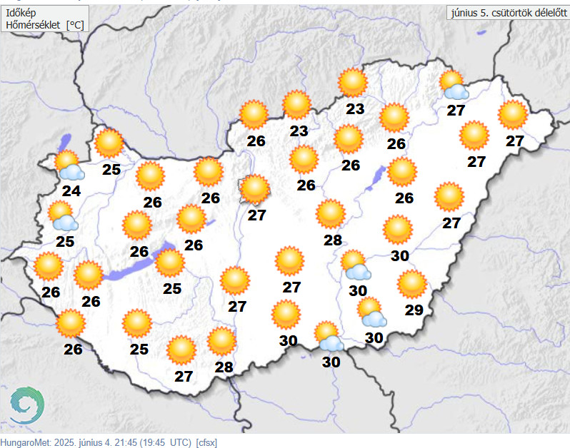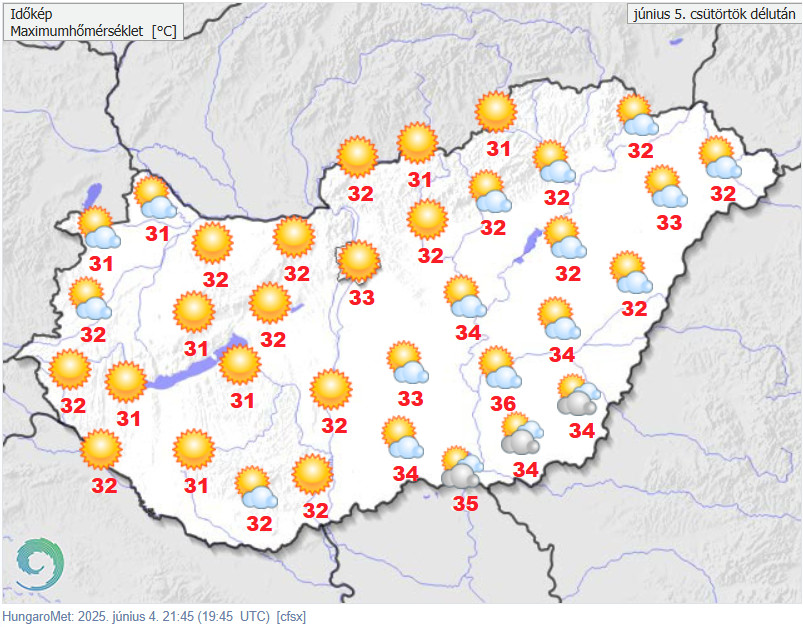 Csütörtökön általában derült vagy gyengén felhős, napos idő várható, de a fölénk érkező szaharai por miatt szűrtebb lehet a napsütés. A délutáni, esti órákban a délkeleti tájakon előfordulhat zápor, zivatar. A délnyugati, déli szél sokfelé megélénkül, a Dunántúl nyugati és északi részein meg is erősödik. Zivatarok környezetében viharos széllökések is lehetnek. A hőmérséklet csúcsértéke általában 31 és 35 fok között várható.