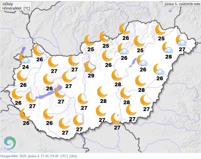 A HungaroMet térképén látszik, hogy még este is közel 30 Celsius-fok várható.