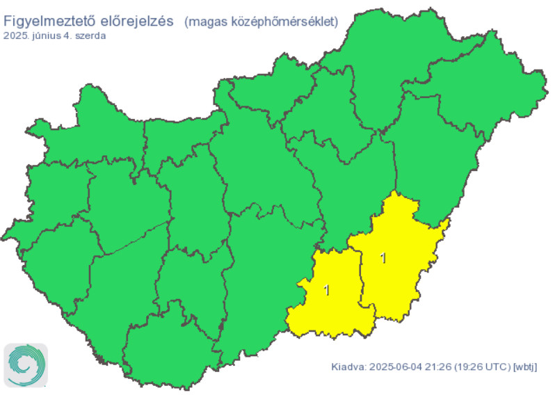 Sárga meteorológiai figyelmeztetés van érvényben két vármegyére, ahol a napi középhőmérséklet 25 Celsius-fok felett alakulhat.