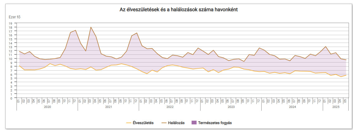 Mint írták, január-májusban 29 018 gyermek jött világra, 9,0 százalékkal, 2863-mal kevesebb, mint az előző év azonos időszakában, ezen belül januárban 4,2, február-márciusban 8,6, április-májusban 12 százalékkal kevesebb volt az élveszületések száma, mint 2024 azonos időszakaiban.