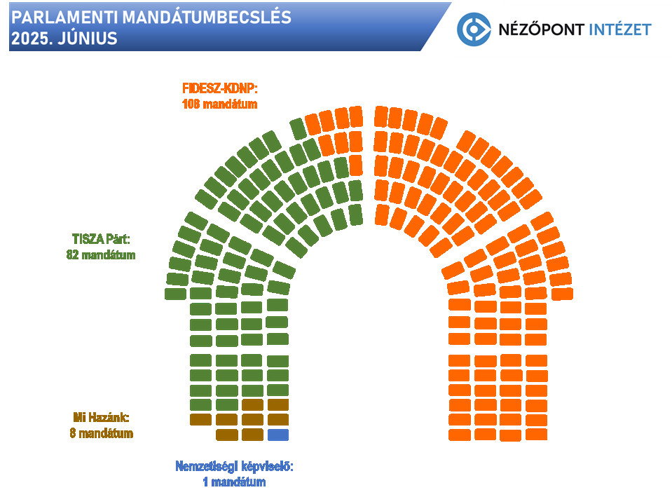 A Nézőpont Intézet elkészítette a „legvalószínűbb listás eredmény” alapján az új Országgyűlés összetételére vonatkozó mandátumbecslését is. A számítás során az EP-választási eredményeket vették figyelembe szavazóköri szinten, az országos közvélemény-kutatási adatokat 2024 és 2025 júniusában, valamint az egyes szavazótáborok településtípus szerinti változását. Ezek alapján egy most vasárnap tartott választás során a Fidesz 108, a Tisza Párt 82, a Mi Hazánk Mozgalom pedig 8 mandátumot szerezne. A 199. mandátum pedig a német nemzetiségi képviselőnek jutna.