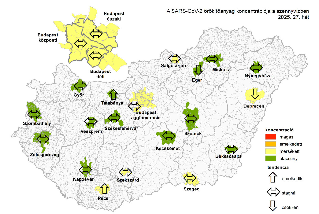 z év 27. hetében a szennyvízben a koronavírus koncentrációja országosan stagnált, enyhén emelkedett. Így volt ez 18 ellátási területen, emelkedést tapasztaltak Pécsett és Tatabányán, míg csökkenést Debrecenben és Egerben figyeltek meg.