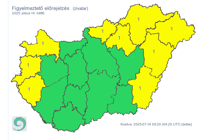 A keleti határszélen reggel még nem várható zivatar. Délután kezdetben az északkeleti harmadban fordulhat elő egy-egy zivatar, majd késő délutántól a nyugati tájakon növekszik meg a zivatarhajlam. Környezetükben viharos (60-70 km/h) széllökés, kisebb méretű jég (~1 cm), intenzív csapadék (10-20 mm) előfordulhat.