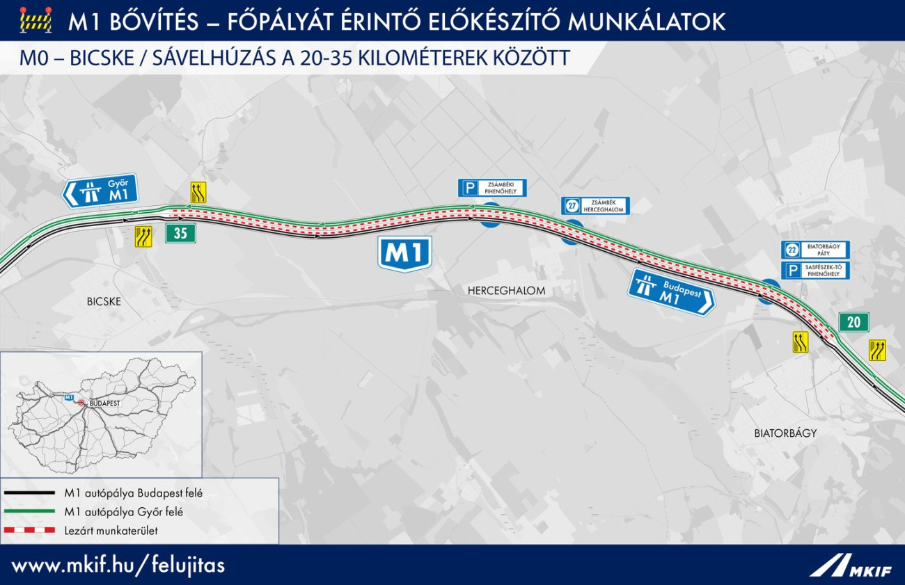 Az autópályakezelő tájékoztatása szerint az elsőként indult Óbarok és Tatabánya közti (42–56 km) munkálat mellett ezen a héten még két helyszínen, Komárom és Concó pihenőhely között (84–96km), illetve az M0 és Bicske közti szakaszon (20–35km) a forgalmat sávelhúzással mindkét oldalon a külső és a leállósávra terelik.