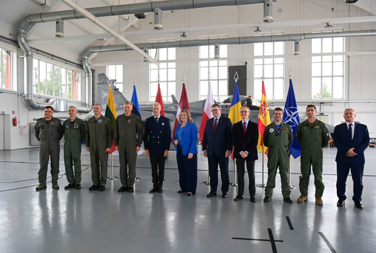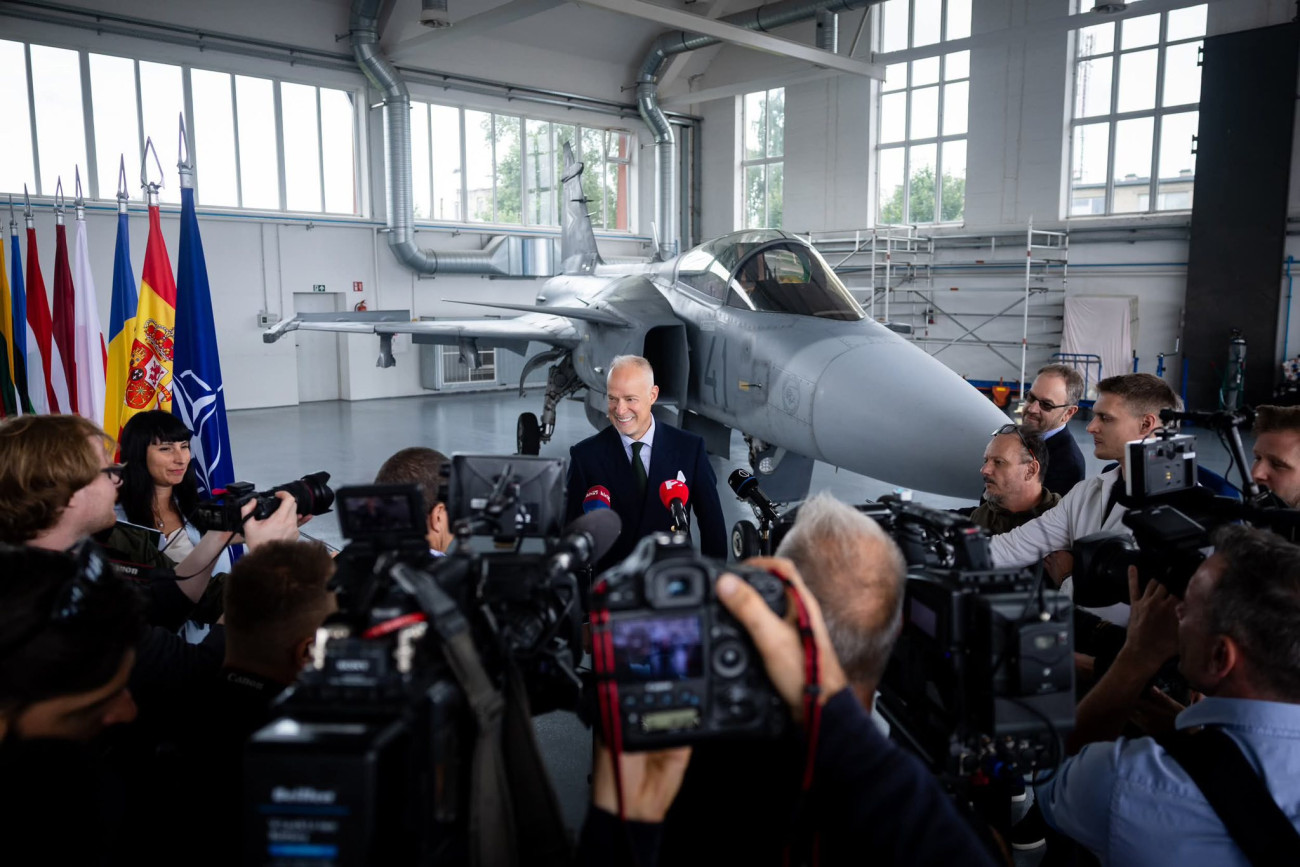 Szalay-Bobrovniczky Kristóf honvédelmi miniszter (b5) és Loreta Maskalioviené, a litván védelmi miniszter (k) a litvániai Siauliai melletti légibázison 2025. július 31-én. A magyar légierő négy JAS-39C Gripen vadászgépe a NATO Baltic Air Policing (BAP) missziójának keretében, a spanyol légierővel közösen átvette a lengyel és a román légierőtől a balti államok, vagyis Észtország, Lettország és Litvánia légterének felügyeletét.