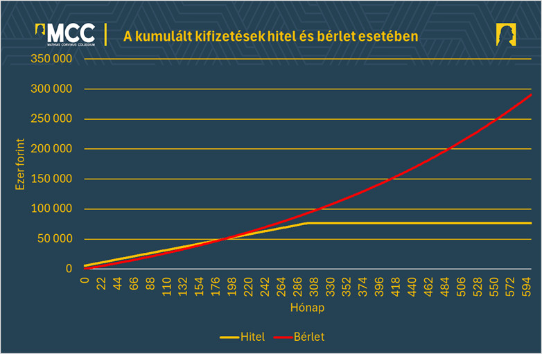Az 52. hónaptól azonban a különbség csökkenni kezd. Ennek megfelelően nem meglepő, hogy a két kumulált kiadásérték egy idő után találkozik. Ez a pillanat a 187. hónapban következik be, azaz nagyjából 15,5 év múlva. Innentől viszont a hitel előnye növekszik folyamatosan, egészen a 25. évig, azaz a 300. hónapig, amikortól a hitelt választó fiatal kiadásai már egy fillérrel sem növekednek, míg a bérlet mellett döntőé egyre meredekebb növekedést mutat.