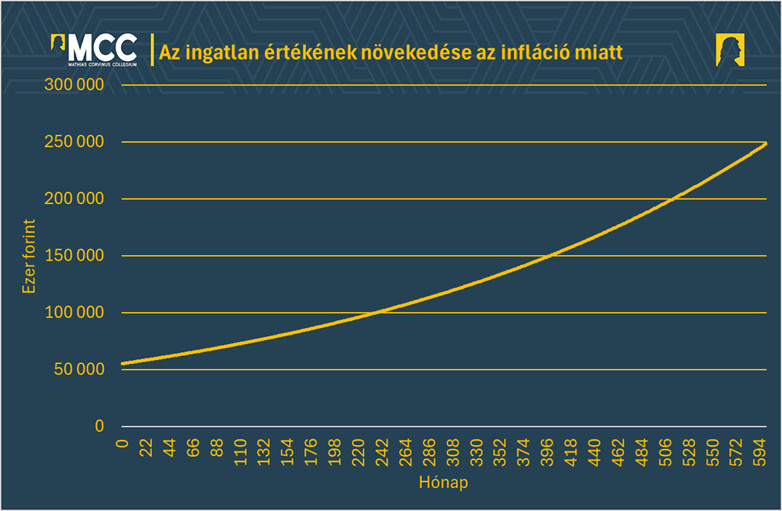 Amit ráadásul a fenti számítás sem vett figyelembe, az az, hogy a hitelt választó fiatalnak van egy értékes ingatlana. Hogy milyen értékes, azt a lenti grafikon mutatja, mely ugyancsak a 3 százalékos inflációs értékkel számolt.