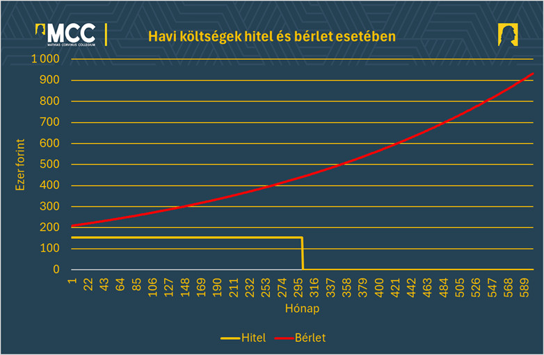 Ám ez az összefüggés az 52 hónapban, azaz kicsivel több mint 4 év után megváltozik. Innentől a folyamatos infláció miatt a lakásbérlet már magasabb havi költséggel jár, mint a hitel törlesztése. És ez a különbség egyre nő.