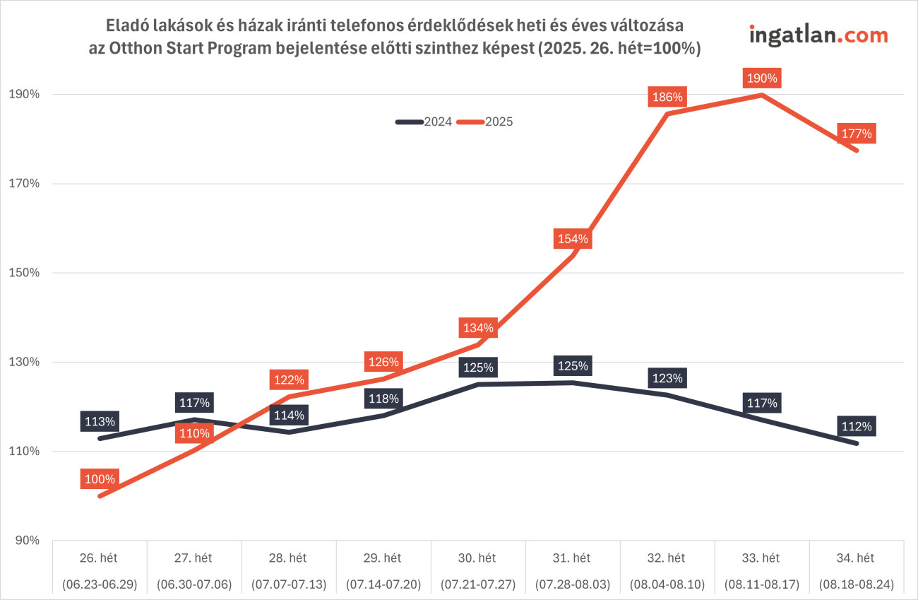 Az ingatlan.com adatai alapján a legnagyobb keresletnövekedés Budapesten és a megyei jogú városokban és vármegyeszékhelyeken történt, ezekben a lokációkban a 33. héten 94–110 százalékkal ugrott meg az érdeklődések száma az eladó lakások és házak iránt. A keresletélénkülés viszont országos jellegű: a kisebb városokban 85, a községekben pedig 64 százalékkal nőtt a telefonos érdeklődések száma az Otthon Start Program bejelentése előtti időszakhoz képest.