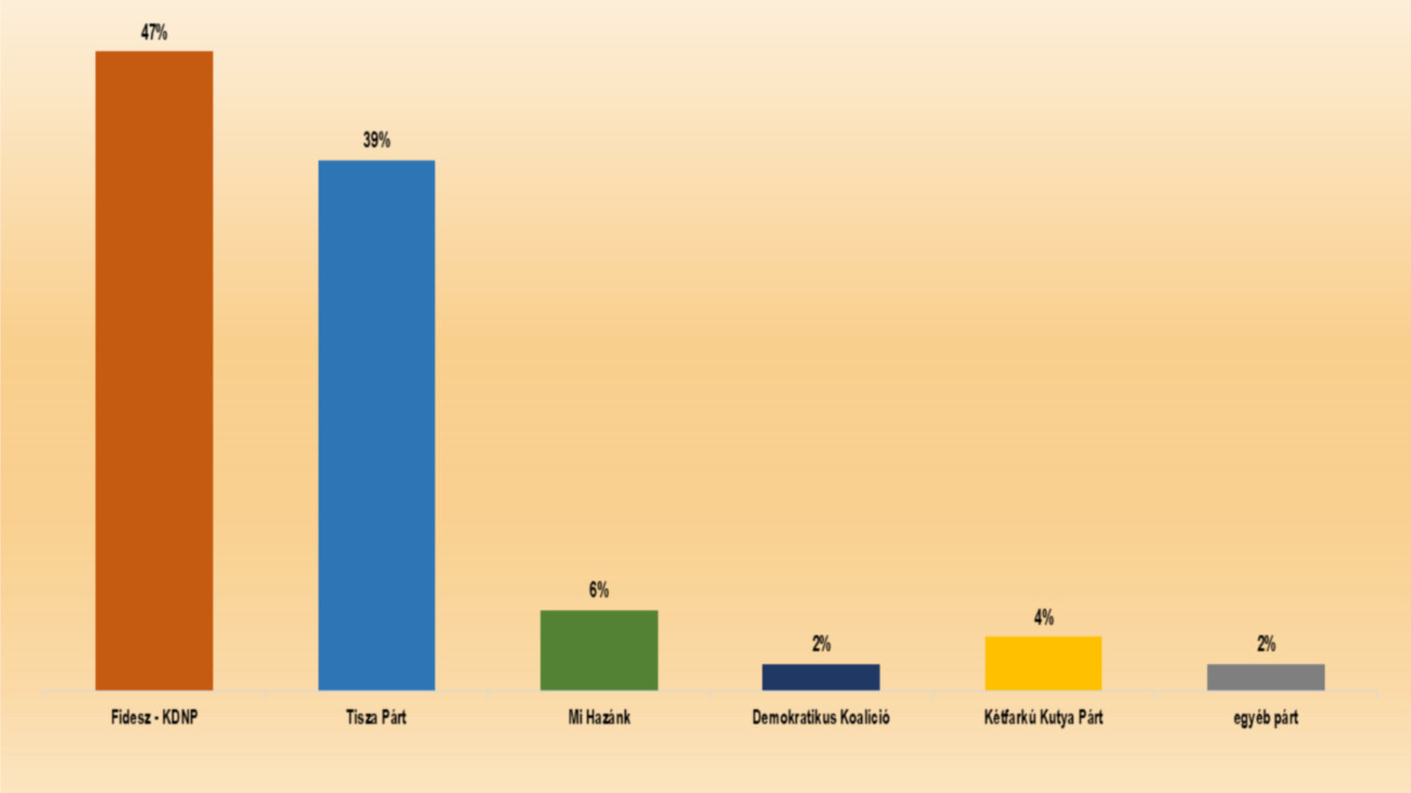 A Magyar Társadalomkutató Híradó.hu-n is megjelent friss felmérése szerint a Fidesz–KDNP továbbra is a legnépszerűbb politikai erő, a kormánypártokat az aktív szavazó pártválasztók 47 százaléka támogatja, szemben a Tisza Párt 39 százalékával.