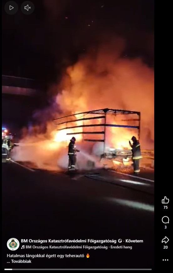 Hatalmas lángokkal égő teherautóról számolt be Facebook-oldalán a BM Országos Katasztrófavédelmi Főigazgatóság.
