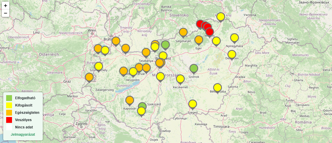 Szentgotthárd, Sopron, Mosonmagyaróvár, Győr, Ajka, Várpalota, Székesfehérvár, Tatabánya, Esztergom, Kaposvár, Százhalombatta, Tököl, Salgótarján, Eger levegője egészségtelen.