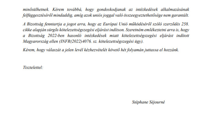 „A fentiekre tekintettel arra kérem Önöket, hogy küldjék meg válaszukat ezen intézkedések indokolásával és érvényességi idejével kapcsolatban, amelyek az uniós jog megsértésének minősülhetnek. Kérem továbbá, hogy gondoskodjanak az intézkedések alkalmazásának felfüggesztéséről mindaddig, amíg azok uniós joggal való összeegyeztethetősége nem garantált” – zárul a Nagy Márton nemzetgazdasági miniszternek címzett levél.