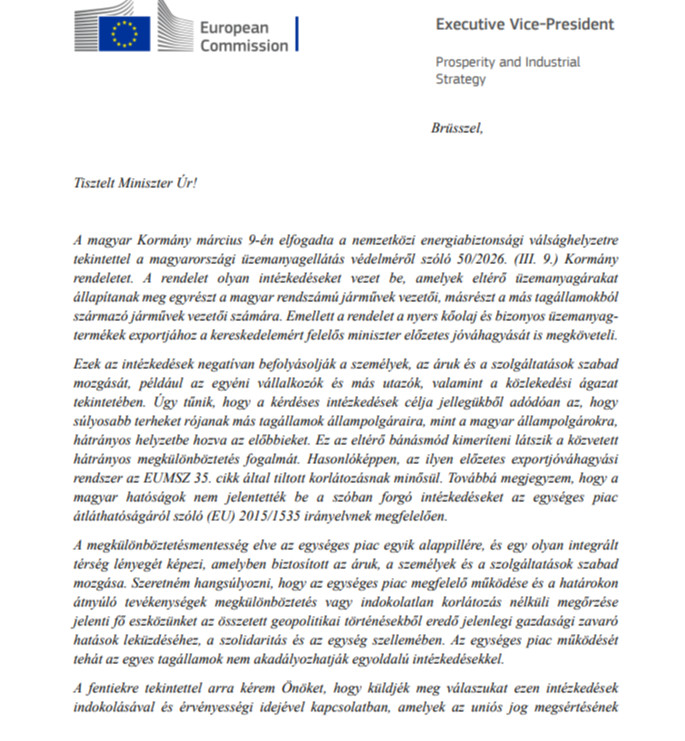 „A magyar kormány március 9-én elfogadta a nemzetközi energiabiztonsági válsághelyzetre tekintettel a magyarországi üzemanyag-ellátás védelméről szóló 50/2026. (III. 9.) Kormány rendeletet. A rendelet olyan intézkedéseket vezet be, amelyek eltérő üzemanyagárakat állapítanak meg egyrészt a magyar rendszámú járművek vezetői, másrészt a más tagállamokból származó járművek vezetői számára. Emellett a rendelet a nyers kőolaj és bizonyos üzemanyagtermékek exportjához a kereskedelemért felelős miniszter előzetes jóváhagyását is megköveteli” – olvasható az Európai Bizottság levelében, amit a magyar kormánynak küldtek, amit a Mandiner megszerzett.