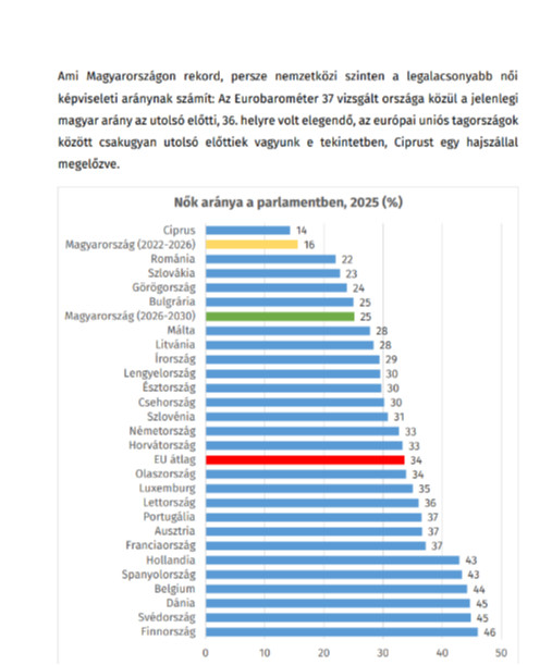 - A Tisza győzelme után alakuló parlamentben 25 százalékos női aránnyal Magyarország továbbra is az EU-átlag alatt lesz, de jó pár helyezést javít: 27. helyett 21. lesz az EU-ban.
