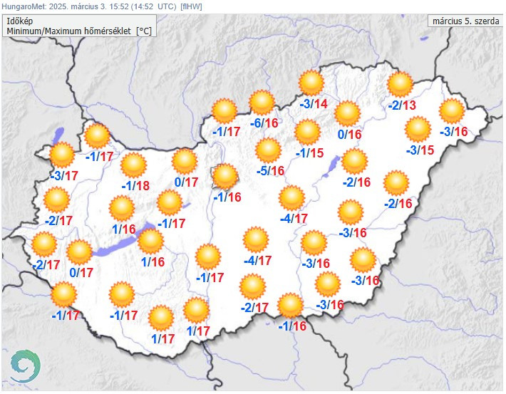 Szerdán is ködfoltosan indul a hajnal, de azok feloszlása után derült, napos idő várható. A légmozgás mérsékelt marad. A hőmérséklet hajnalban -6 és +1, délután 13 és 18 fok között valószínű.
