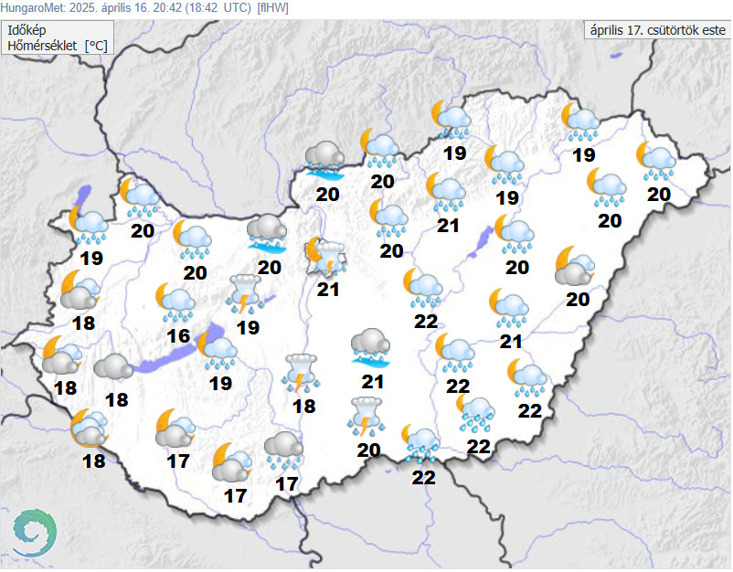 Csütörtökön az átmeneti felhőzetcsökkenést követően délnyugat felől erőteljessé válik a gomolyfelhő-képződés, ott kevesebb, az ország nagyobb részén viszont sok napsütés valószínű. Délutántól növekszik a záporok, zivatarok előfordulási esélye és számossága, amelyek dél felől észak felé terjednek, és rendszerbe is szerveződhetnek. A déli, délkeleti szél csaknem országszerte élénk lesz, amelyet több helyen erős széllökések kísérhetnek. Zivatarok környezetében átmenetileg viharossá fokozódhat a szél.