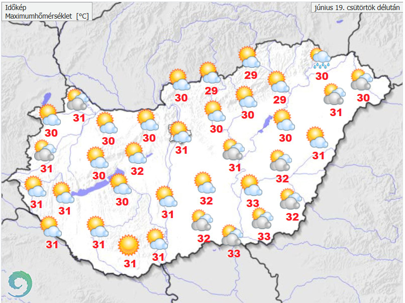 Csütörtökön a fátyol- és gomolyfelhők mellett általában sok napsütés, döntően száraz idő várható, csupán az északkeleti járásokban fordulhat elő gyenge zápor. A szél északnyugatira fordul, és egyre nagyobb területen megélénkül, helyenként erős széllökések is előfordulnak.