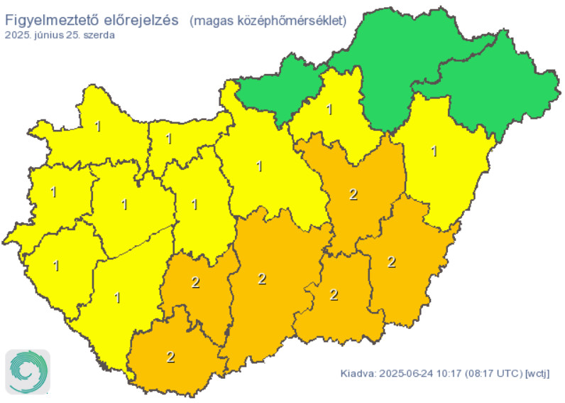 A meteorológiai szolgálat szerdára másodfokú (narancs) figyelmeztetést adott ki Csongrád-Csanád, Békés, Bács-Kiskun és Jász-Nagykun-Szolnok vármegye területére, a három vármegyében a napi középhőmérséklet 27 Celsius-fok felett alakulhat. Az ország többi részén - Nógrád, Borsod-Abaúj-Zemplén és Szabolcs-Szatmár-Bereg vármegyék kivételével - elsőfokú figyelmeztetés van érvényben, itt a napi középhőmérséklet 25 fok felett lehet szerdán.