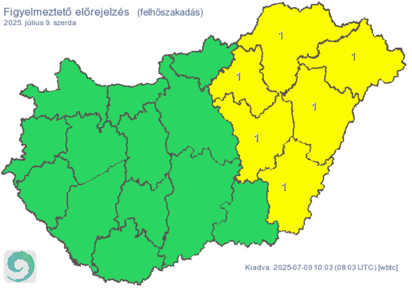 A HungaroMet sárga figyelmeztetést tart életben a szélerősség, a lehulló csapadékmennyiség és zivatar kialakulásának veszélye miatt számos vármegyére (frissülő térképek itt).