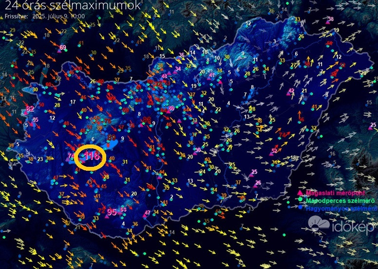 Nemcsak a zivatarokat kíséri viharos széllökés, hajnal óta a Dunántúlon és Budapest környékén többfelé az alapszél viharos, 60 km/órát meghaladó, amit 80-90 km/órás széllökések kísérnek – írta adatai alapján az Időkép. Budapesten kora hajnal óra rendületlenül süvít a szél, Fonyód Várhegyen pedig orkán erejű, 116 km/órás széllökést mértek hajnalban.