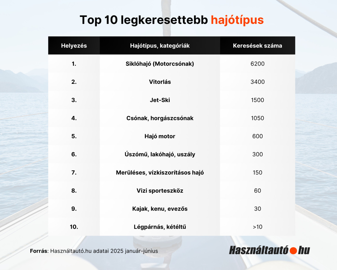 A motoros vízi járművek vezetik az érdeklődési listát: a motorcsónakok kategóriája 6200 érdeklődőt ért el június végéig, 1300 aktív hirdetéssel. A vitorlások 3430 keresést gyűjtöttek össze, miközben 540 aktív hirdetés volt elérhető a kategóriában. A jet-skik pedig 1540 kereséssel a harmadik legnépszerűbb hajótípusnak számítanak és 290 ilyen járművet kínáltak eladásra a hirdetők