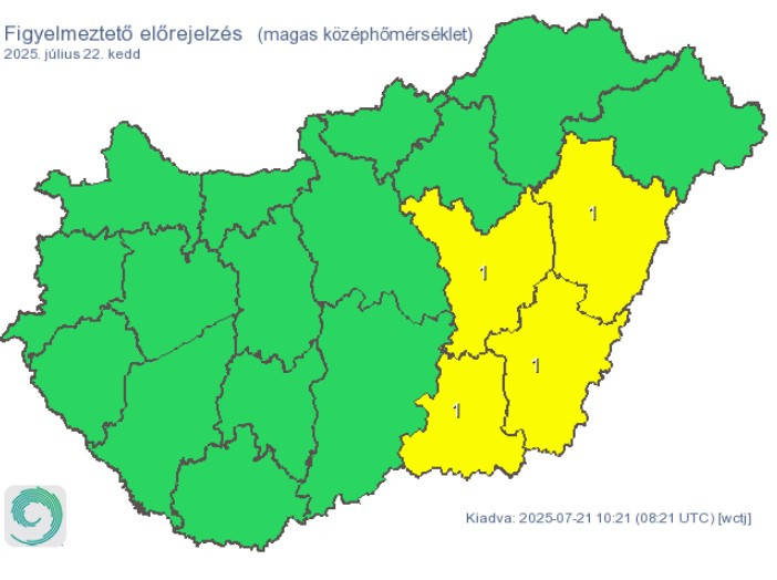 A HungaroMet előrejelzése szerint citromsárga, elsőfokú figyelmeztetés van életben négy keleti vármegyére vonatkozóan, ahol a napi középhőmérséklet 25 Celsius-fok felett alakulhat.