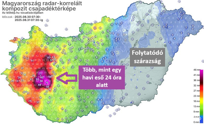 Több, mint egyhavi mennyiségnek megfelelő eső zúdult a nyugati országrészre 24 óra alatt – tudósított az Időkép. A HungaroMet adatai szerint az 1991-2020 közötti időszakban az augusztusi csapadék átlaga 59,5 mm volt – ehhez képest vasárnap reggel 7.45-kor Tapolca és Lengyeltóti vezetett az Időkép adatai szerint 71 és 70 mm egynapi csapadékkal, de a Balaton nyugati régiójában és a Bakonyban is számos helyen 50 mm feletti értékeket mértek, Bakonybél például 62 mm-nél járt akkor.