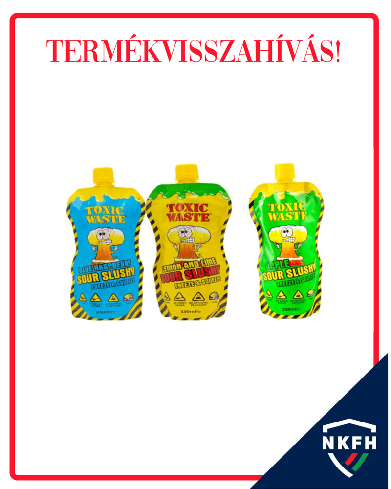 amennyiben valaki vásárolt 250 milliliteres kiszerelésű, Toxic Waste Sour Slushy elnevezésű, kék málna, citrom & lime, vagy alma ízesítésű jégkását, azt ne fogyassza el.