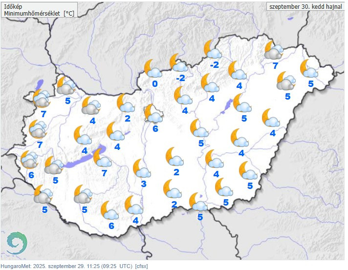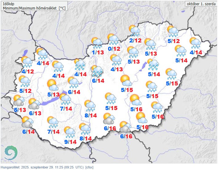 Szerdán közepesen vagy erősen felhős időre van kilátás szórványosan záporral, de egy-egy helyen zivatar is lehet. Az északi, északkeleti szél megélénkül, néhol megerősödik. A hőmérséklet hajnalban 0, +9, délután 12, 16 fok között alakul.