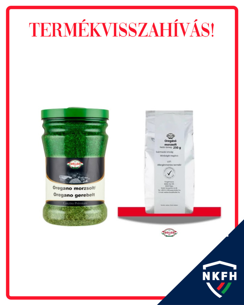 A Böllér-Ker Kft. visszahívja az általa forgalmazott Oregánó morzsolt megnevezésű terméket, mert olívalevél-szennyeződés található benne - közölte a Nemzeti Kereskedelmi és Fogyasztóvédelmi Hatóság.