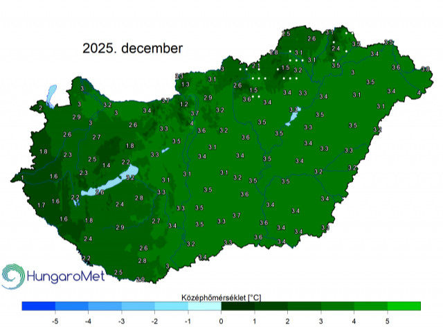 A tavalyi év tizenkettedik hónapjáról készített elemzésben azt írták, a hónap középhőmérséklete országos átlagban 3,0 Celsius-fok volt, ami jelentősen, 2,5 fokkal haladja meg az 1991–2020-as évek átlagát. Hozzátették: minden mérőállomáson fagypont felett volt a havi középhőmérséklet és nem alakult ki számottevő különbség a hegyi és síkvidéki területek között.