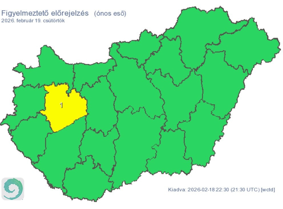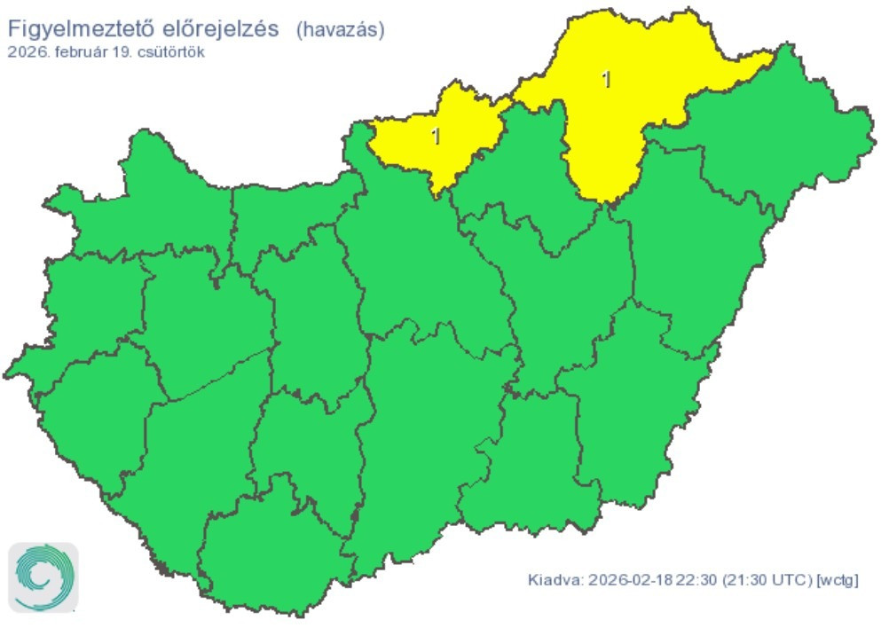 Egy vármegyére ónos eső, kettőre havazás miatt adtak ki elsőfokú figyelmeztetést csütörtökre.