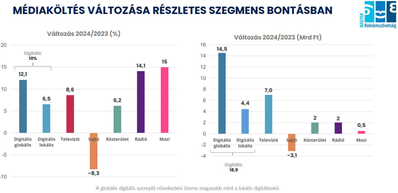 A 2024-es évet jellemző változások közül az elnök kiemelte: akár a médiatorta szeleteit, akár a non-média területét nézzük, látszik, hogy tavaly a növekedési ütemek közelebb kerültek egymáshoz az ezt megelőző évhez képest. Egyszerre lépett az ágazat majd minden szelete, nem voltak nagyon kiugró vagy nagyon lemaradó területek. Egy kivételt említett: a sajtóhoz érkező reklámbevételek mennyisége csökkent, de az összes többi viszonylag közel volt egymáshoz, ami nagyon stabil évet jelez.