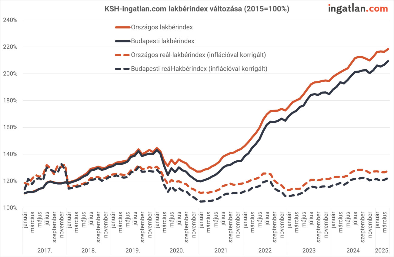 Enyhe drágulás jellemzi mind az országos, mind a budapesti albérletpiacot a KSH-ingatlan.com lakbérindexe szerint. A legfrissebb adatok szerint áprilisban országosan 0,9 százalékos, a fővárosban pedig 1,3 százalékos emelkedés történt az előző hónaphoz képest. Éves összevetésben országosan 7,6, Budapesten pedig 8,6 százalékos drágulás következett be.