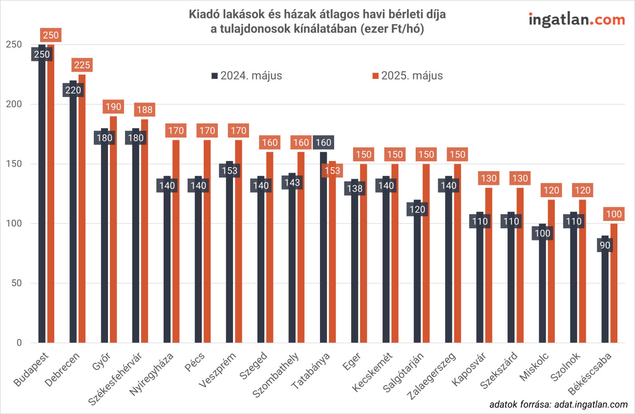 „Budapesten és Debrecenben a viszonylag magas albérletárak középértéke lényegében nem változott az előző évhez képest. A fővárosban 250 ezer, Debrecenben pedig 225 ezer forintos havi átlagos bérleti díj jellemzi a piacot. Ugyanakkor Szegeden, Pécsen és Győrben 10-30 ezer forinttal feljebb mentek a bérleti díjak, így ezekben az egyetemvárosokban 160-190 ezer forint az átlag. Miskolcon is drágulás következett be, így 120 ezer forintért kínálják a kiadó lakóingatlanokat, szemben a tavalyi 100 ezer forintos összeggel” – mondta a szakember.