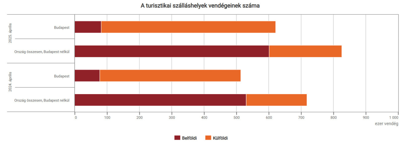2025. áprilisban a szezonálisan kiigazított adatok alapján a vendégek száma 5,6, a vendégéjszakáké 4,4 százalékkal bővült 2024 áprilisához képest. A vendégek 69 százaléka érkezett a kereskedelmi szálláshelyekre, ahol a számuk 14 százalékkal emelkedett az előző évihez képest. A magán- és egyéb szálláshelyeken 27 százalékkal több vendéget regisztráltak, mint egy évvel korábban.