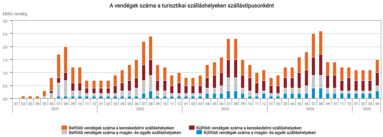2025. január–áprilisban az előző év azonos időszakához képest a turisztikai szálláshelyeken 11 százalékkal több, összesen 4,6 millió vendéget regisztráltak. A belföldi vendégek száma 4,1, a külföldieké 18 százalékkal több (közel 2,2 millió, illetve 2,4 millió) volt a turisztikai szálláshelyeken.