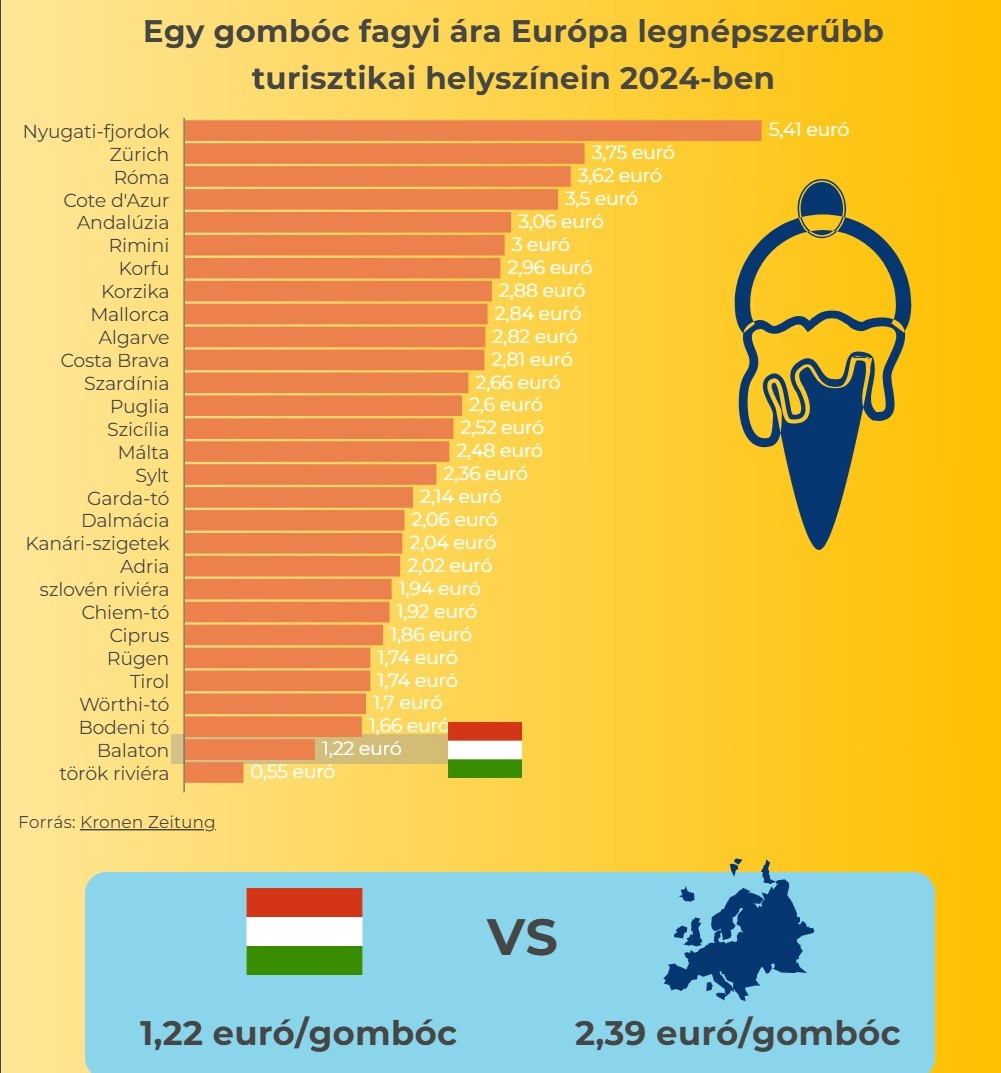 Az összeállítás szerint a balatoni fagyi ára tavaly 1,22 euró volt, a hazai fagyi így olcsónak számított.