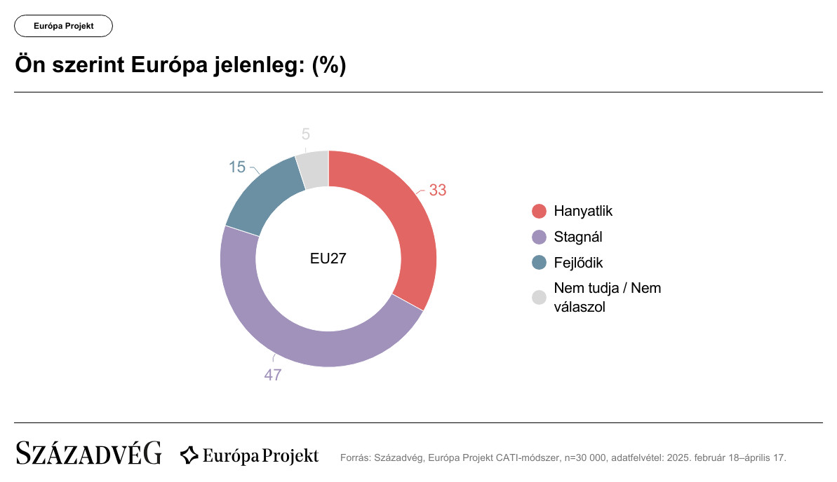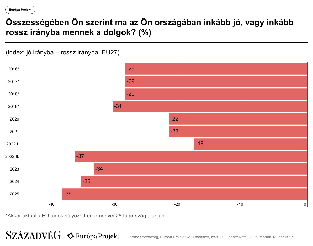 A Századvég Európa Projekt-kutatása alapján 2025-ben 39 százalékkal többen gondolták, hogy rossz irányba mennek a dolgok mint, akik a jó irányt jelölték meg.