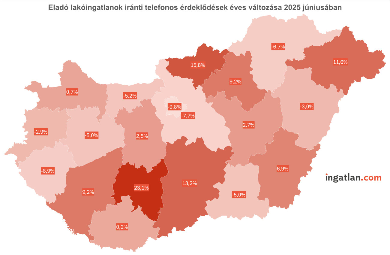 „A jelenség abból a szempontból nem meglepő, hogy az év eleji lendület folyamatosan lecseng, és most a legmegfizethetőbb lakásárakkal rendelkező vármegyék lakáspiaca számít élénknek” – mondta Balogh László, az ingatlan.com vezető gazdasági szakértője. Az eladó lakóingatlanok iránti telefonhívások tavaly júniushoz képest Tolna (+23 százalék), Nógrád (+16 százalék), Bács-Kiskun (+13 százalék) és Szabolcs-Szatmár-Bereg (+12 százalék) vármegyékben növekedtek a legnagyobb mértékben.