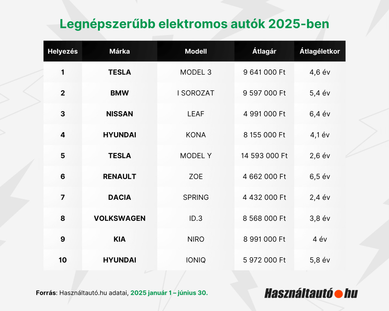 A legnépszerűbb elektromos autók között a top 10 márkánál három már ötmillió forint alatt elérhető. Ilyen a Nissan LEAF, a Renault Zoe és a Dacia Spring. A Hyundai Ioniq átlagára 5,9 millió forint, a Teslánál a Model Y-t leszámítva 8 és 10 millió forint között mozognak az árak. Koralewszky Márk arra is kitért, hogy az elektromos autók átlagéletkora jelentősen alacsonyabb: míg a belső égésű motoros autók átlagéletkora 13 és 15 év közötti, az elektromosnál a 4-6 év a jellemző.