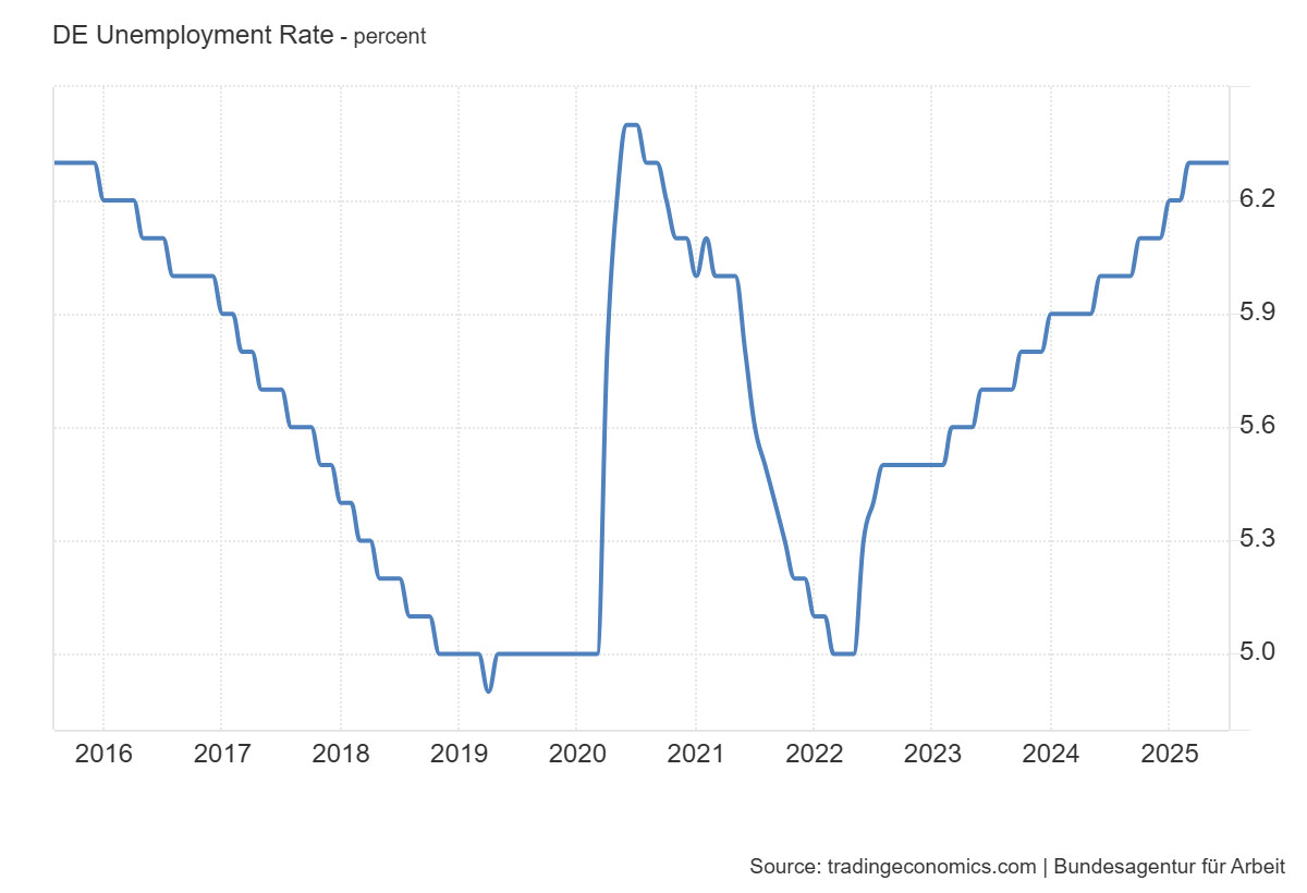 2021 és 2022 során a helyzet viszonylag gyorsan konszolidálódott, a ráta ismét visszasüllyedt 5 százalék közelébe. Azonban 2023-tól újra emelkedő pályára állt, és 2025 elején ismét 6,2 százalék körül járt. Ez az újbóli növekedés már nem egy egyszeri válság következménye, hanem inkább a fent is bemutatott strukturális problémák lenyomata- Az ipari szerkezetváltás, a magas energiaárak és a digitalizáció következtében átalakuló foglalkoztatási igények mind hozzájárulnak a munkanélküliség makacs emelkedéséhez.