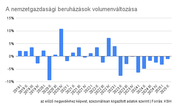 A KSH adatai szerint mindeközben utoljára 2023 első negyedévében nőtt a beruházások volumene az előző negyedévhez képest, azóta minden egyes negyedévben csökkenés volt tapasztalható, mint az alábbi grafikon is mutatja.