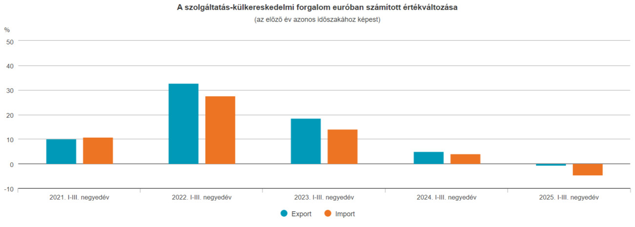 A Központi Statisztikai Hivatal hétfőn azt is közölte, hogy 2025 harmadik negyedévében a szolgáltatások euróban számított exportja 1,4 százalékkal bővült, importja 4,1 százalékkal mérséklődött az előző év azonos időszakihoz képest. Az aktívum 3,9 milliárd euró volt, 415 millió euróval több a 2024. harmadik negyedévinél.
