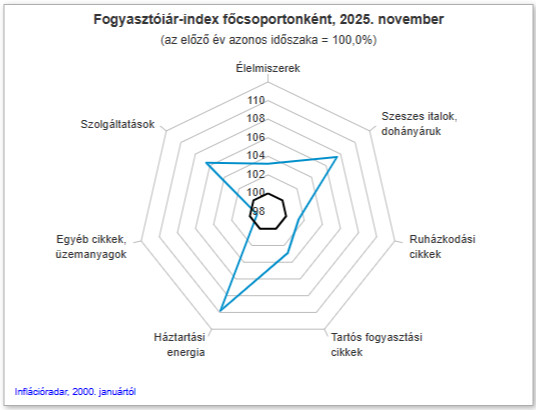 Az elemző az InfoRádióban azt mondta, hogy az infláció szerkezetében sem volt nagy meglepetés novemberben, vagyis a havi átárazások szempontjából alapvetően egy nyugodt hónap van mögöttünk. Az élelmiszerárak a – KSH-s statisztika szerint – havi alapon 0,2 százalékkal emelkedtek, miközben az üzemanyagárak 0,6 százalékkal csökkentek. Pozitívan járultak hozzá az inflációhoz a tartós- és ruházati cikkek árai, amik 0,2, illetve 0,7 százalékkal drágultak hó per hó alapon, míg a szolgáltatások árai 0,1 százalékkal mérséklődtek. Ez utóbbi adat szolgált némi pozitív meglepetéssel, főként az üdülési szolgáltatások, illetve a repülőjegyek árának csökkenése miatt – jegyezte meg Nyeste Orsolya.